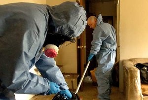Crime scene cleanup crews are formally called CTS Decon crews (crime and trauma scene decontamination). They clear away dangerous material at the biologically contaminated scene of a violent death such as a homicide, suicide, or accident. They also specialize in cleaning up chemically contaminated spaces and buildings. The most prevalent of these circumstances is former methamphetamine-producing laboratories, or anthrax-exposure sites.