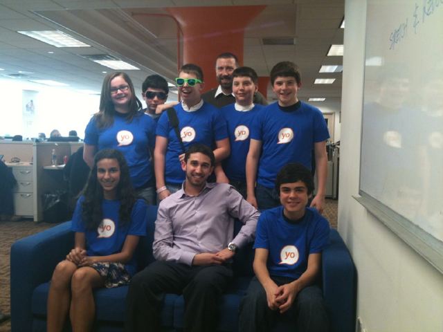 Photo caption: Yodle co-founder Ben Rubenstein sits with a group of seventh- and eighth-graders from the Saints Philip and James School in St. James and their teacher George Haines. (April 21, 2011)